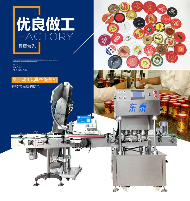 該直線式真空旋蓋機(jī)是東泰機(jī)械結(jié)合用戶使用情況,摒棄了傳統(tǒng)轉(zhuǎn)盤式真空旋蓋機(jī)的弊端,研制開發(fā)的新型高效設(shè)備,設(shè)備自動(dòng)檢測(cè)到兩個(gè)瓶子蓋子進(jìn)入到雙頭真空旋蓋機(jī)內(nèi),旋蓋機(jī)彩色顯示屏?xí)?shí)時(shí)顯示旋蓋狀況,整機(jī)多點(diǎn)檢測(cè),當(dāng)進(jìn)口無瓶無蓋、出口堵塞、定位不準(zhǔn)、瓶身傾倒均自動(dòng)停機(jī)。單個(gè)旋蓋頭達(dá)到的真空度都可以單獨(dú)顯示,單獨(dú)調(diào)整。合格