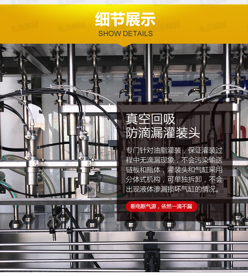 2、設(shè)計(jì)及真空回吸系統(tǒng)保證灌裝過程中無滴漏現(xiàn)象,不會(huì)污染輸送鏈板和瓶體。灌裝頭和氣缸采用分體式機(jī)構(gòu),可單獨(dú)拆卸,不會(huì)出現(xiàn)液體滲漏損壞氣缸的情況。亞德客氣缸經(jīng)久耐用,其他密封等配件使用標(biāo)準(zhǔn)件,更換維護(hù)簡(jiǎn)單方便。