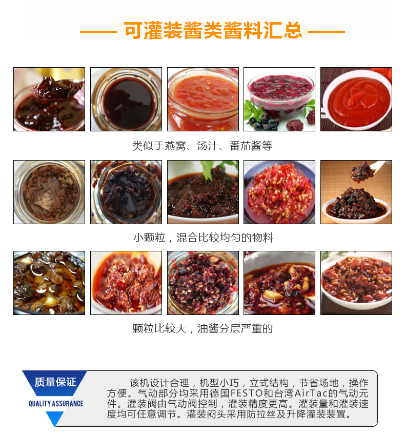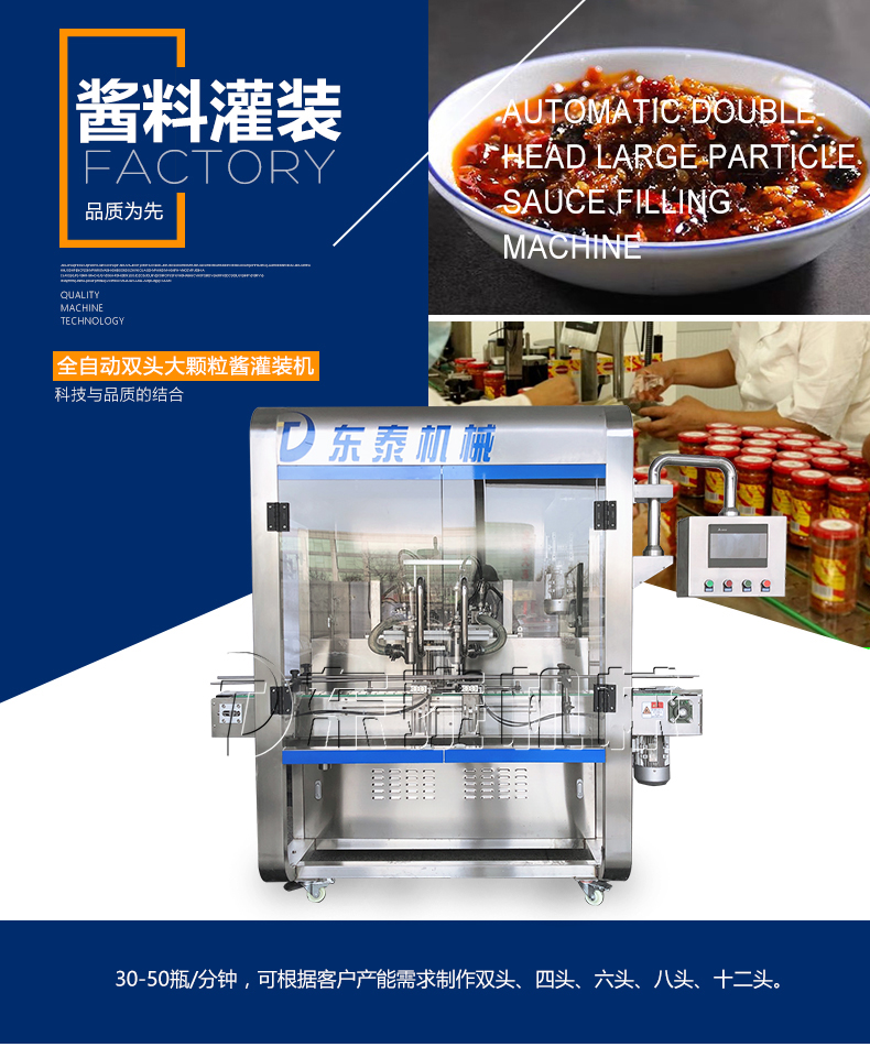 身為公司新生產(chǎn)制造的灌裝機(jī)在行業(yè)市場上發(fā)揮了重要的作用,是集光,機(jī),電,氣于一體,選用活塞式定量原理,灌裝精確度高,使用比較簡單,維護(hù)非常方便,設(shè)備主要材質(zhì):辣椒醬灌裝機(jī)選用SUS304不銹鋼制造,衛(wèi)生指標(biāo)要求.灌裝環(huán)節(jié)選用亞克力透明板與外部隔離,確保灌裝的衛(wèi)生要求。灌裝選用壓力式灌裝,無須配裝高位罐,簡易化了組裝工序,提高了灌裝工作效率??善毡槭褂糜谑称?、醬料制造業(yè)設(shè)備的自動化包裝生產(chǎn)制造